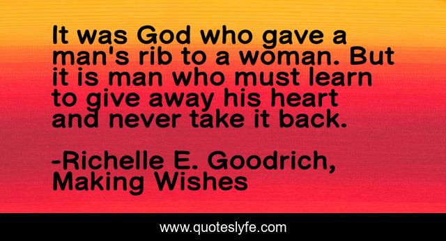 This page presents the quote "It was God who gave a man's rib to a woman. But it is man who must learn to give away his heart and never take it back.". Author of this quote is Richelle E. Goodrich, Making Wishes. This quote is about relationships, love, god, commitment, adam-and-eve, richelle, richelle-goodrich, affection,.