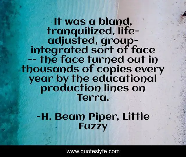 This page presents the quote "It was a bland, tranquilized, life-adjusted, group-integrated sort of face -- the face turned out in thousands of copies every year by the educational production lines on Terra.". Author of this quote is H. Beam Piper, Little Fuzzy. This quote is about conformity, educational-system, education, faces,.