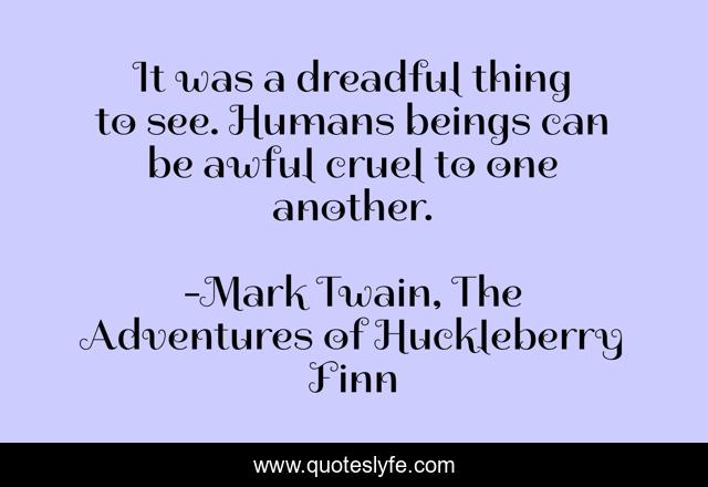 This page presents the quote "It was a dreadful thing to see. Humans beings can be awful cruel to one another.". Author of this quote is Mark Twain, The Adventures of Huckleberry Finn. This quote is about humans, huck-finn, mark-twain, mgg, cruelty,.