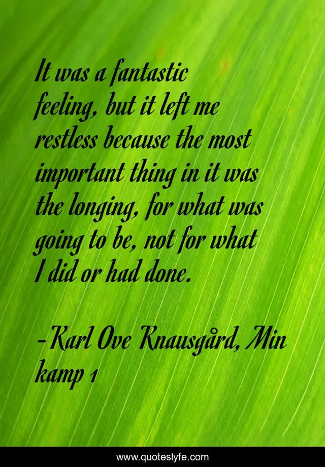 This page presents the quote "It was a fantastic feeling, but it left me restless because the most important thing in it was the longing, for what was going to be, not for what I did or had done.". Author of this quote is Karl Ove Knausgård, Min kamp 1. .