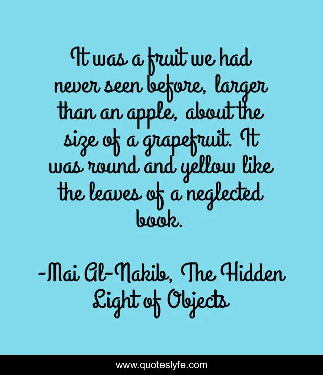 This page presents the quote "It was a fruit we had never seen before, larger than an apple, about the size of a grapefruit. It was round and yellow like the leaves of a neglected book.". Author of this quote is Mai Al-Nakib, The Hidden Light of Objects. This quote is about books, fruit,.