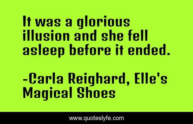 This page presents the quote "It was a glorious illusion and she fell asleep before it ended.". Author of this quote is Carla Reighard, Elle's Magical Shoes. This quote is about dreams, fantasy-books, illusions,.