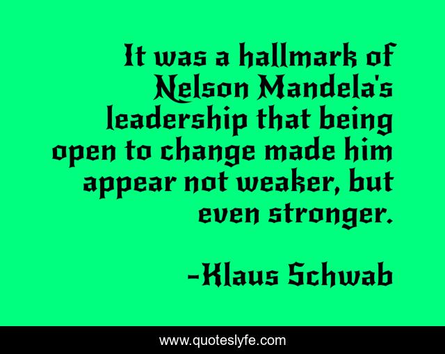 This page presents the quote "It was a hallmark of Nelson Mandela's leadership that being open to change made him appear not weaker, but even stronger.". Author of this quote is Klaus Schwab. This quote is about stronger, him, change,.