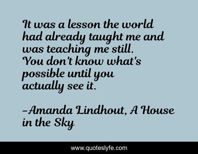 This page presents the quote "It was a lesson the world had already taught me and was teaching me still. You don't know what's possible until you actually see it.". Author of this quote is Amanda Lindhout, A House in the Sky. This quote is about society, life, war,.