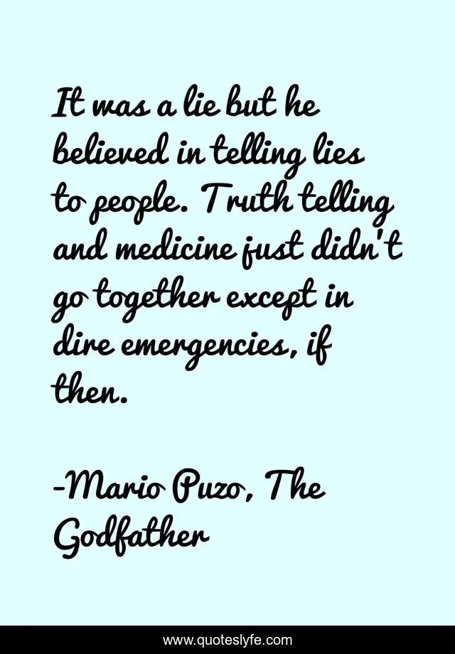 This page presents the quote "It was a lie but he believed in telling lies to people. Truth telling and medicine just didn't go together except in dire emergencies, if then.". Author of this quote is Mario Puzo, The Godfather. .
