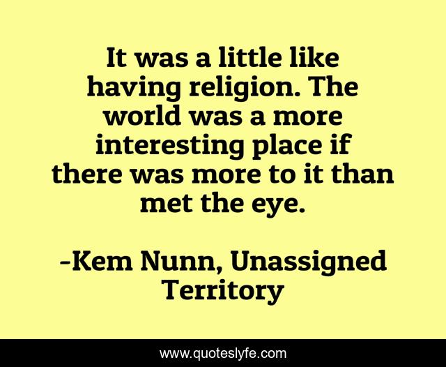This page presents the quote "It was a little like having religion. The world was a more interesting place if there was more to it than met the eye.". Author of this quote is Kem Nunn, Unassigned Territory. .