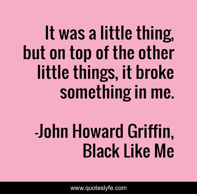 This page presents the quote "It was a little thing, but on top of the other little things, it broke something in me.". Author of this quote is John Howard Griffin, Black Like Me. This quote is about emotion, self-control, despair, frustration, self-discipline, depression,.