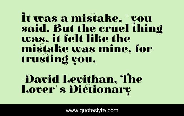 This page presents the quote "It was a mistake, " you said. But the cruel thing was, it felt like the mistake was mine, for trusting you.". Author of this quote is David Levithan, The Lover's Dictionary. This quote is about trust, betrayal,.