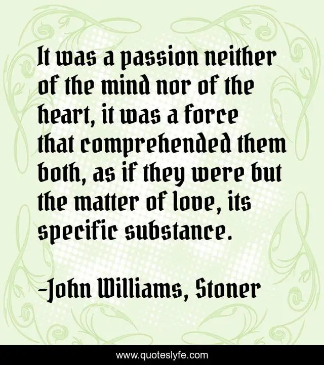 This page presents the quote "It was a passion neither of the mind nor of the heart, it was a force that comprehended them both, as if they were but the matter of love, its specific substance.". Author of this quote is John Williams, Stoner. This quote is about relationships, love, john-williams, mind, unity, passion, affection,.
