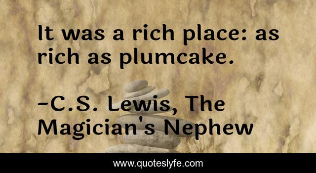This page presents the quote "It was a rich place: as rich as plumcake.". Author of this quote is C.S. Lewis, The Magician's Nephew. This quote is about food, forest, rich,.
