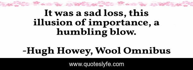 This page presents the quote "It was a sad loss, this illusion of importance, a humbling blow.". Author of this quote is Hugh Howey, Wool Omnibus. This quote is about wool, illusion, dystopia,.
