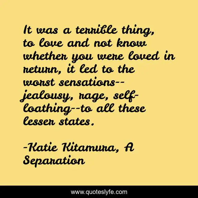 This page presents the quote "It was a terrible thing, to love and not know whether you were loved in return, it led to the worst sensations--jealousy, rage, self-loathing--to all these lesser states.". Author of this quote is Katie Kitamura, A Separation. .