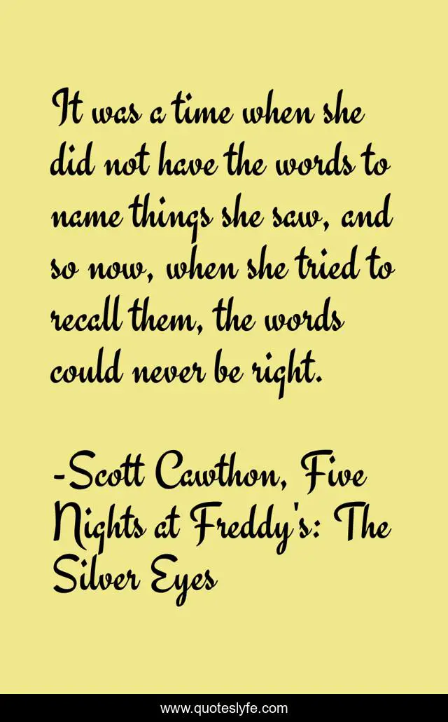 This page presents the quote "It was a time when she did not have the words to name things she saw, and so now, when she tried to recall them, the words could never be right.". Author of this quote is Scott Cawthon, Five Nights at Freddy's: The Silver Eyes. This quote is about childhood, memory,.