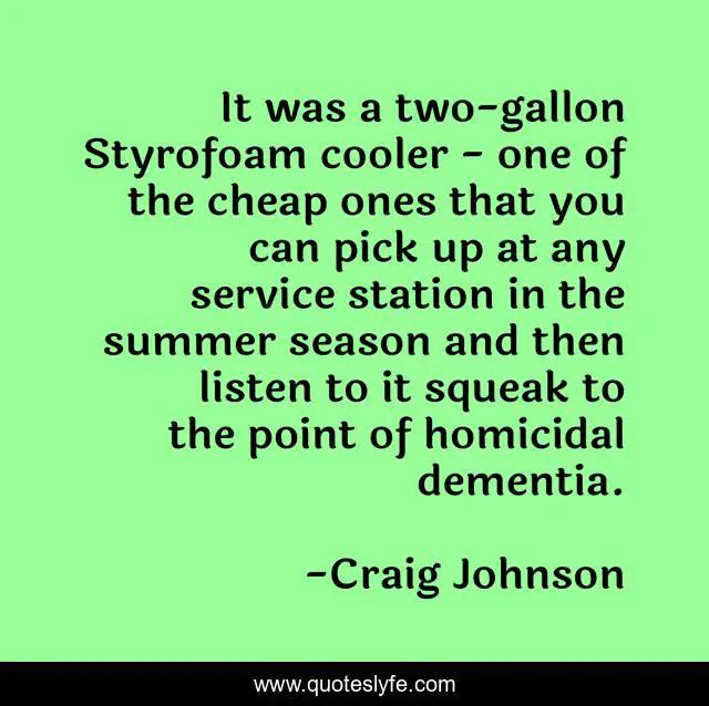 This page presents the quote "It was a two-gallon Styrofoam cooler - one of the cheap ones that you can pick up at any service station in the summer season and then listen to it squeak to the point of homicidal dementia.". Author of this quote is Craig Johnson. This quote is about mystery, walt-longmire,.