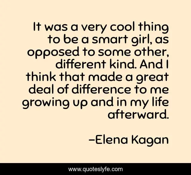 This page presents the quote "It was a very cool thing to be a smart girl, as opposed to some other, different kind. And I think that made a great deal of difference to me growing up and in my life afterward.". Author of this quote is Elena Kagan. This quote is about life, great, girl,.
