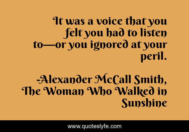 This page presents the quote "It was a voice that you felt you had to listen to—or you ignored at your peril.". Author of this quote is Alexander McCall Smith, The Woman Who Walked in Sunshine. This quote is about peril, advice, voice, alexander-mccall-smith, voices,.