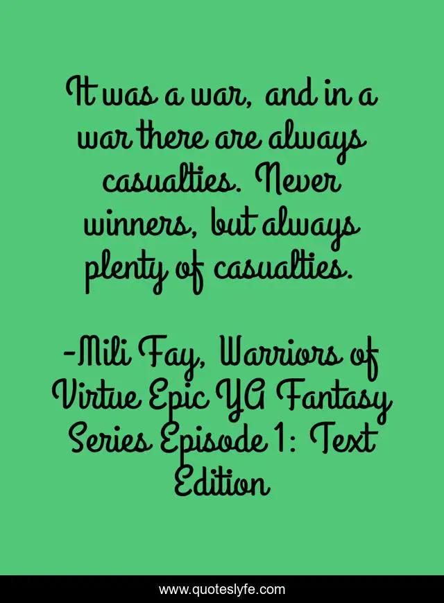 This page presents the quote "It was a war, and in a war there are always casualties. Never winners, but always plenty of casualties.". Author of this quote is Mili Fay, Warriors of Virtue Epic YA Fantasy Series Episode 1: Text Edition. This quote is about casualties-of-war, warrior, sad-but-true, war,.