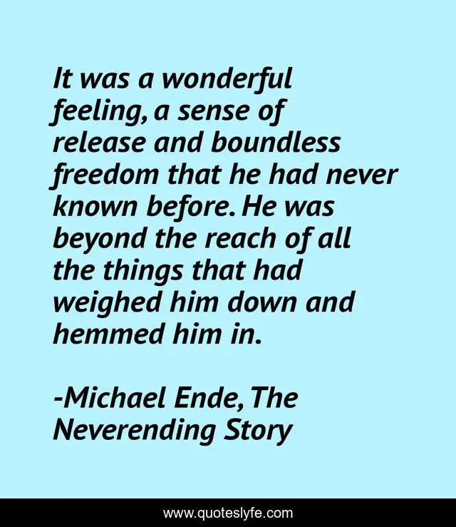 This page presents the quote "It was a wonderful feeling, a sense of release and boundless freedom that he had never known before. He was beyond the reach of all the things that had weighed him down and hemmed him in.". Author of this quote is Michael Ende, The Neverending Story. This quote is about freedom, death, calm, peace,.