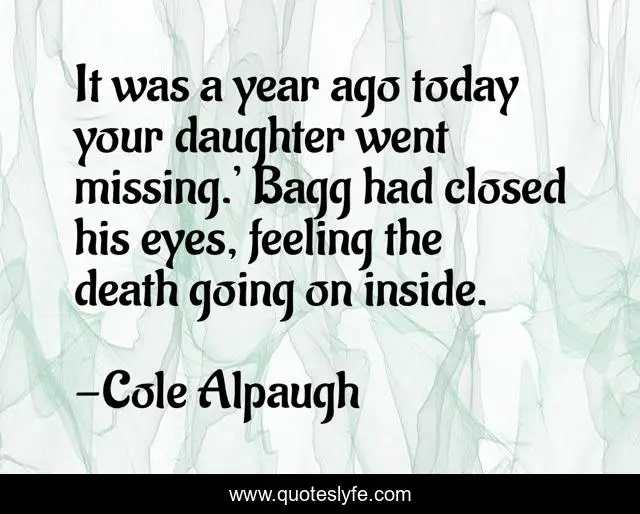 This page presents the quote "It was a year ago today your daughter went missing.’ Bagg had closed his eyes, feeling the death going on inside.". Author of this quote is Cole Alpaugh. This quote is about death, love, circus, bear, literary-fiction, affection,.