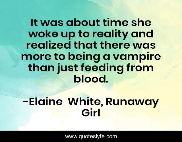 This page presents the quote "It was about time she woke up to reality and realized that there was more to being a vampire than just feeding from blood.". Author of this quote is Elaine White, Runaway Girl. This quote is about love, challenge, paranormal, vampire, romance, unrequited-love, battle, emotional, affection,.