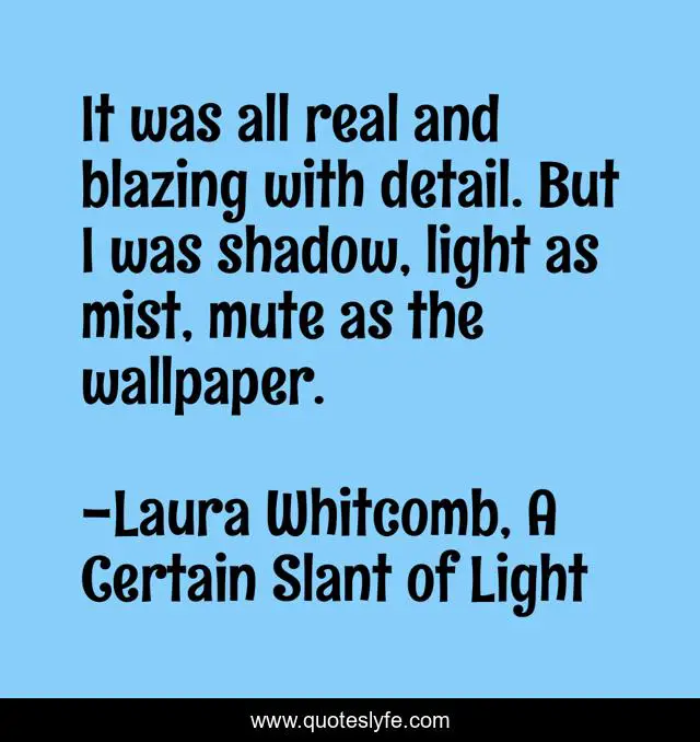 This page presents the quote "It was all real and blazing with detail. But I was shadow, light as mist, mute as the wallpaper.". Author of this quote is Laura Whitcomb, A Certain Slant of Light. This quote is about ghost, real, mute, light, invisible, haunting, shadow, mist, powerless,.
