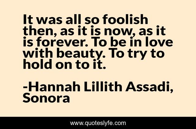 This page presents the quote "It was all so foolish then, as it is now, as it is forever. To be in love with beauty. To try to hold on to it.". Author of this quote is Hannah Lillith Assadi, Sonora. This quote is about foolish, hannah-lillith-assadi, in-love, beauty, sonora,.