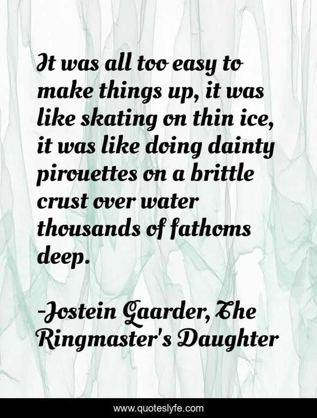 This page presents the quote "It was all too easy to make things up, it was like skating on thin ice, it was like doing dainty pirouettes on a brittle crust over water thousands of fathoms deep.". Author of this quote is Jostein Gaarder, The Ringmaster's Daughter. This quote is about imagination, writing,.
