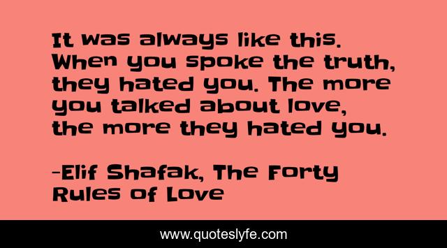 This page presents the quote "It was always like this. When you spoke the truth, they hated you. The more you talked about love, the more they hated you.". Author of this quote is Elif Shafak, The Forty Rules of Love. This quote is about hate, bigotry, love, truth, affection,.