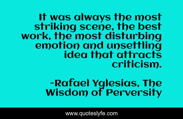 This page presents the quote "It was always the most striking scene, the best work, the most disturbing emotion and unsettling idea that attracts criticism.". Author of this quote is Rafael Yglesias, The Wisdom of Perversity. .
