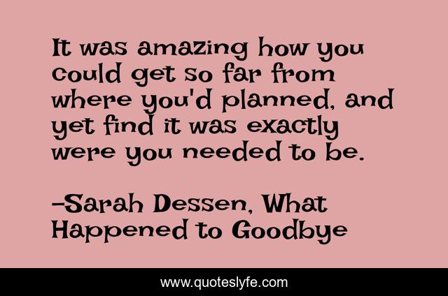 This page presents the quote "It was amazing how you could get so far from where you'd planned, and yet find it was exactly were you needed to be.". Author of this quote is Sarah Dessen, What Happened to Goodbye. This quote is about future, plans,.