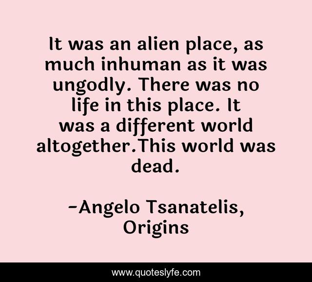 This page presents the quote "It was an alien place, as much inhuman as it was ungodly. There was no life in this place. It was a different world altogether.This world was dead.". Author of this quote is Angelo Tsanatelis, Origins. This quote is about alternate-universe, median-kingdom, fantasy-fiction,.