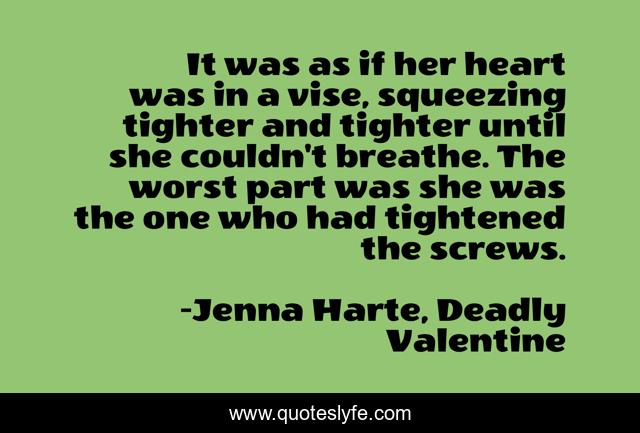 This page presents the quote "It was as if her heart was in a vise, squeezing tighter and tighter until she couldn't breathe. The worst part was she was the one who had tightened the screws.". Author of this quote is Jenna Harte, Deadly Valentine. This quote is about heartache, romance, heartbreak,.