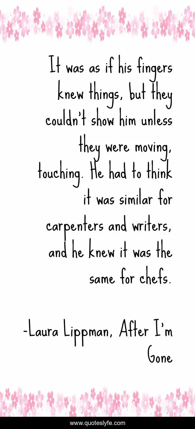 This page presents the quote "It was as if his fingers knew things, but they couldn't show him unless they were moving, touching. He had to think it was similar for carpenters and writers, and he knew it was the same for chefs.". Author of this quote is Laura Lippman, After I'm Gone. This quote is about mystery, family, fiction,.