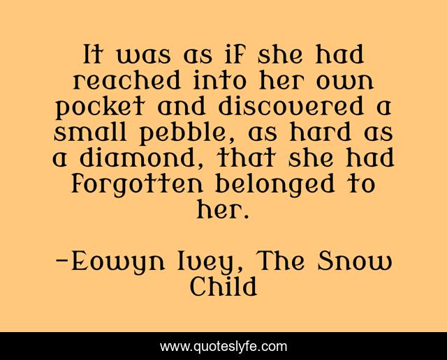 This page presents the quote "It was as if she had reached into her own pocket and discovered a small pebble, as hard as a diamond, that she had forgotten belonged to her.". Author of this quote is Eowyn Ivey, The Snow Child. This quote is about grief, sadness,.