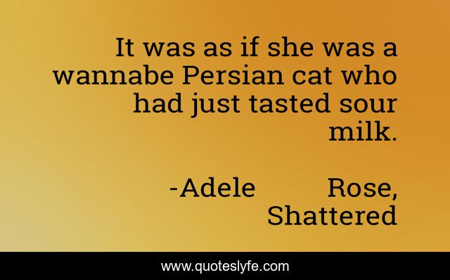 This page presents the quote "It was as if she was a wannabe Persian cat who had just tasted sour milk.". Author of this quote is Adele Rose, Shattered. This quote is about funny, reading, jessica, humour, david, books, young-adult-series, comedy, young-adult-fantasy,.