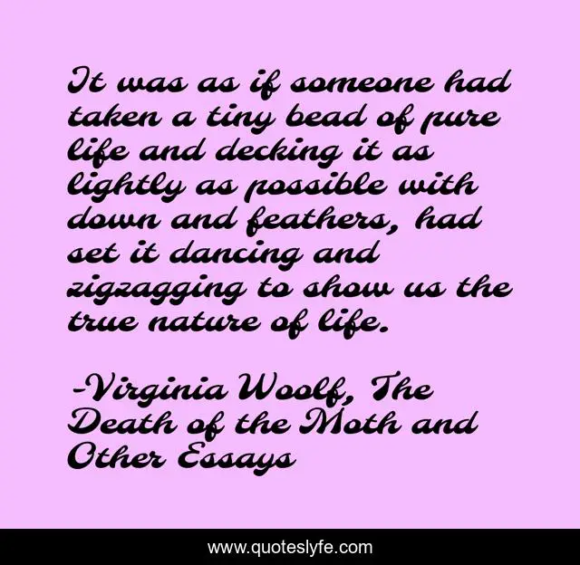 This page presents the quote "It was as if someone had taken a tiny bead of pure life and decking it as lightly as possible with down and feathers, had set it dancing and zigzagging to show us the true nature of life.". Author of this quote is Virginia Woolf, The Death of the Moth and Other Essays. .