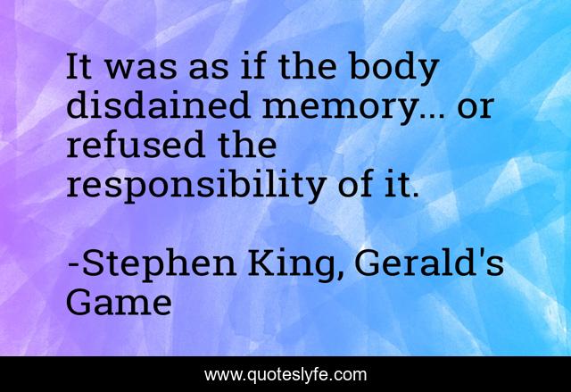 This page presents the quote "It was as if the body disdained memory... or refused the responsibility of it.". Author of this quote is Stephen King, Gerald's Game. .