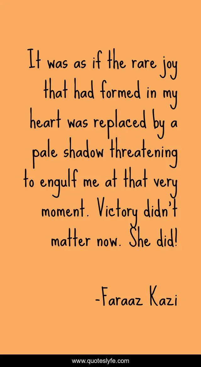 This page presents the quote "It was as if the rare joy that had formed in my heart was replaced by a pale shadow threatening to engulf me at that very moment. Victory didn’t matter now. She did!". Author of this quote is Faraaz Kazi. This quote is about romance, love, affection, sad,.