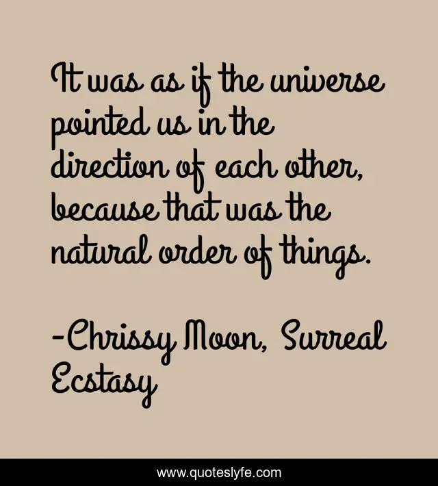 This page presents the quote "It was as if the universe pointed us in the direction of each other, because that was the natural order of things.". Author of this quote is Chrissy Moon, Surreal Ecstasy. This quote is about true-love, love, affection,.