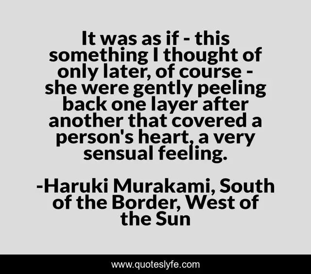 This page presents the quote "It was as if - this something I thought of only later, of course - she were gently peeling back one layer after another that covered a person's heart, a very sensual feeling.". Author of this quote is Haruki Murakami, South of the Border, West of the Sun. This quote is about japan, fiction,.