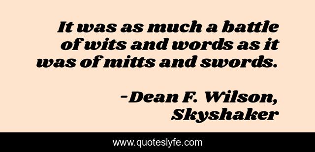 This page presents the quote "It was as much a battle of wits and words as it was of mitts and swords.". Author of this quote is Dean F. Wilson, Skyshaker. This quote is about language, culture, wit, words, battle, war,.