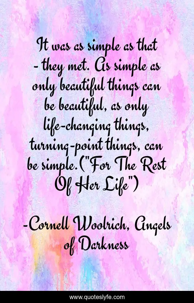 This page presents the quote "It was as simple as that - they met. As simple as only beautiful things can be beautiful, as only life-changing things, turning-point things, can be simple.("For The Rest Of Her Life")". Author of this quote is Cornell Woolrich, Angels of Darkness. This quote is about beautiful, simplicity, love, fate, relationship, simple, life-changing, meeting, affection,.