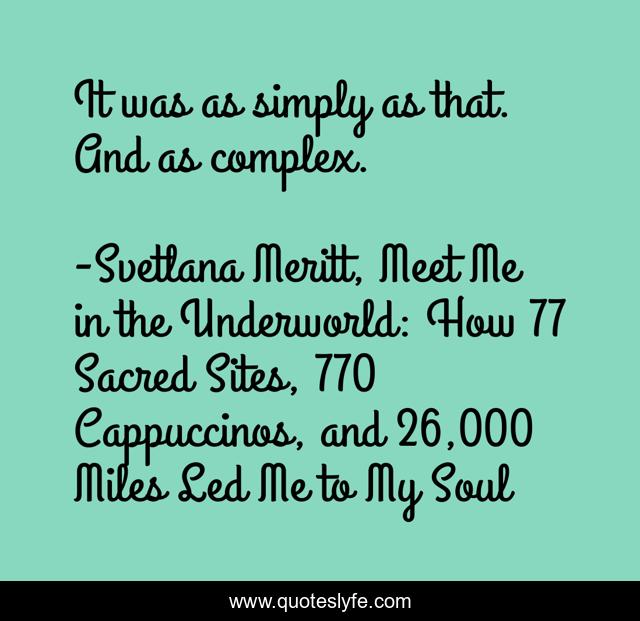 This page presents the quote "It was as simply as that. And as complex.". Author of this quote is Svetlana Meritt, Meet Me in the Underworld: How 77 Sacred Sites, 770 Cappuccinos, and 26,000 Miles Led Me to My Soul. This quote is about spiritual-growth, travel, women-s-strength, inspirational, enthusiasm,.