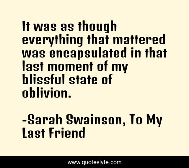 This page presents the quote "It was as though everything that mattered was encapsulated in that last moment of my blissful state of oblivion.". Author of this quote is Sarah Swainson, To My Last Friend. This quote is about drama, love, family, affection, fiction,.