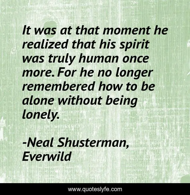 This page presents the quote "It was at that moment he realized that his spirit was truly human once more. For he no longer remembered how to be alone without being lonely.". Author of this quote is Neal Shusterman, Everwild. This quote is about alone, house, mcgill, mikey,.