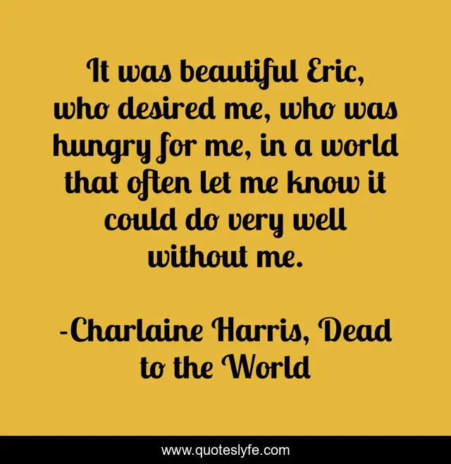This page presents the quote "It was beautiful Eric, who desired me, who was hungry for me, in a world that often let me know it could do very well without me.". Author of this quote is Charlaine Harris, Dead to the World. .