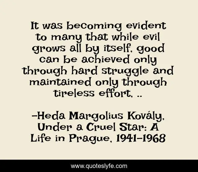 This page presents the quote "It was becoming evident to many that while evil grows all by itself, good can be achieved only through hard struggle and maintained only through tireless effort, ..". Author of this quote is Heda Margolius Kovály, Under a Cruel Star: A Life in Prague, 1941-1968. This quote is about communism, socialism, memoir, war,.