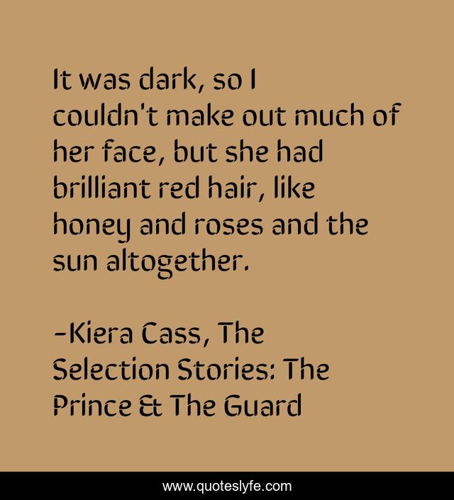 This page presents the quote "It was dark, so I couldn't make out much of her face, but she had brilliant red hair, like honey and roses and the sun altogether.". Author of this quote is Kiera Cass, The Selection Stories: The Prince & The Guard. This quote is about the-selection-stories, the-elite, fiction, the-selection, the-one, kiera-cass, young-adult,.