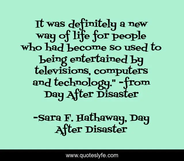 This page presents the quote "It was definitely a new way of life for people who had become so used to being entertained by televisions, computers and technology." -from Day After Disaster". Author of this quote is Sara F. Hathaway, Day After Disaster. This quote is about enthusiasm, apocolyptic, survival, inspirational, adventure,.