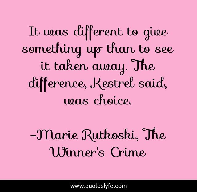 This page presents the quote "It was different to give something up than to see it taken away. The difference, Kestrel said, was choice.". Author of this quote is Marie Rutkoski, The Winner's Crime. This quote is about arin, verex, choice, kestrel, marie-rutkoski, giving-up, puppy,.
